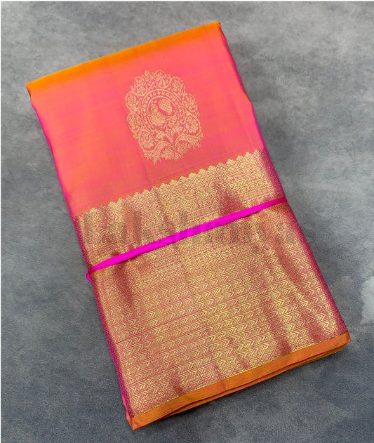 Orangish Pink Dual -Tone Pure Kanchivaram Silk Saree with Golden Zari Border