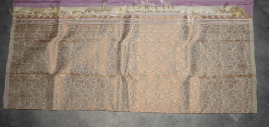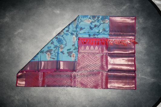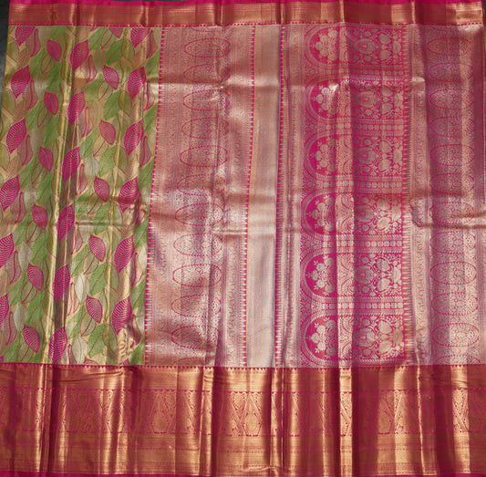 Semi Silk Tissue Saree - Green & Pink Leaves with Pink Border