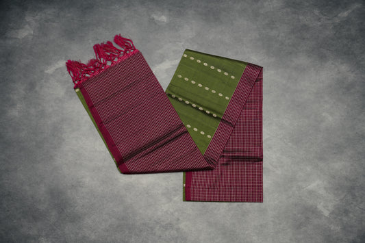 Kanjivaram Bottle Green Silk Saree with Magenta Checked Border