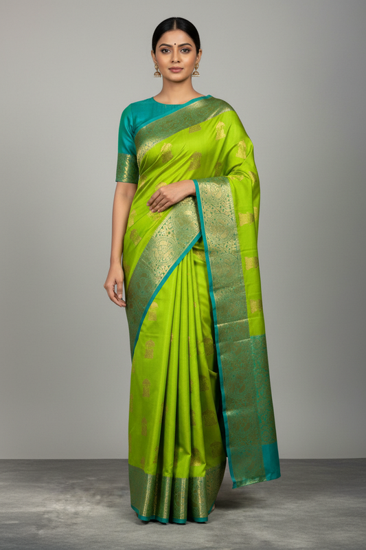 Parrot Green Kanjivaram Silk Saree with Turquoise blue saree