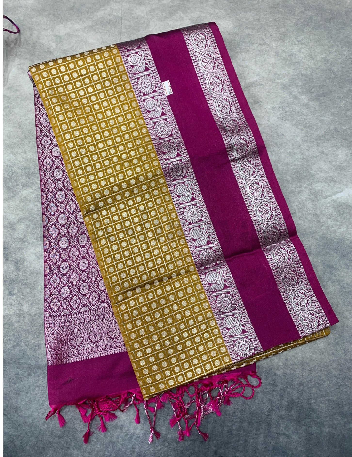 - Mustard Colour Soft Silk Saree with Rich Magenta Rettai Pettu Border