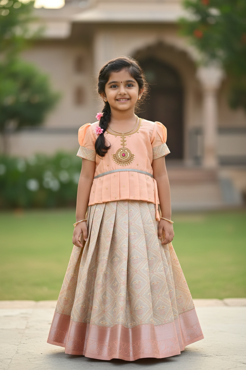 Ready To Wear Pavadai Beige Colour with Peach Colour Blouse